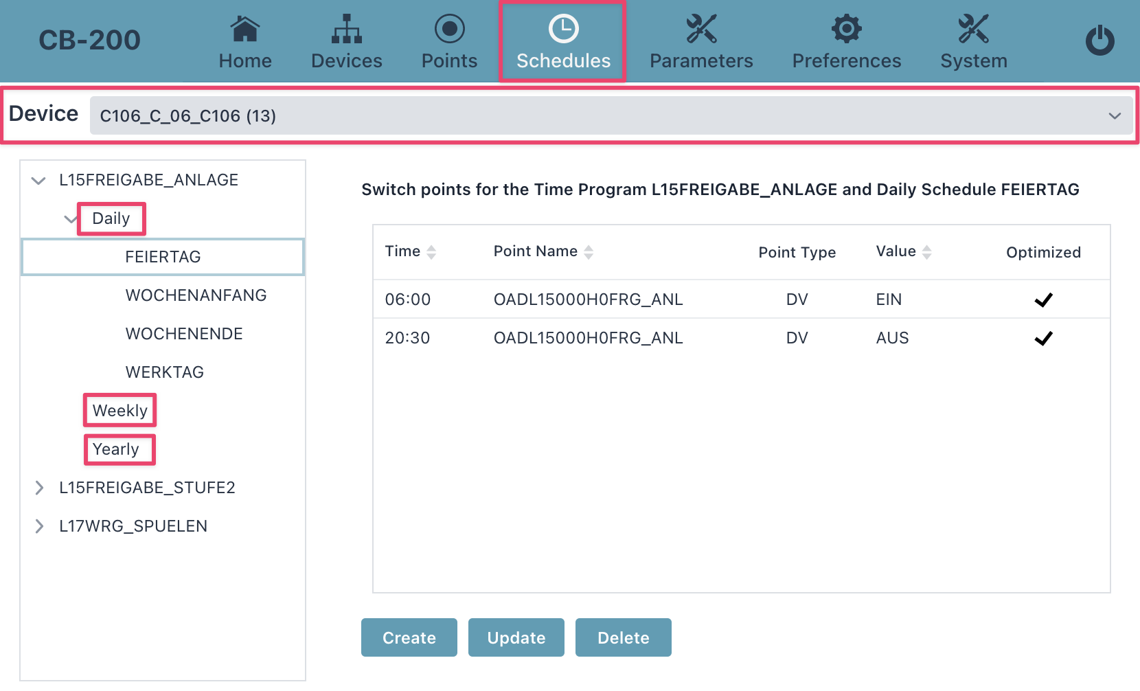 To start the editing, select a controller in the selection list in the top of the view. In Schedule submenu on the left side, you see all time programs defined in the controller. For any of the time programs, you can choose between the daily, weekly and yearly programs editor.